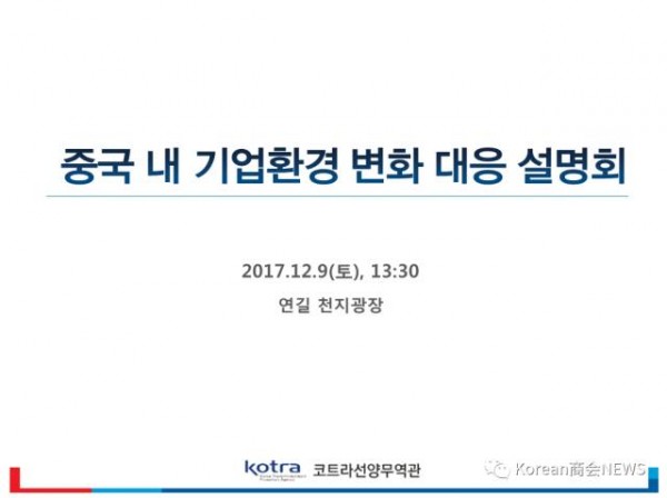 연변한국인상회(회장 신주열)와 코트라선양무역관(관장 이성수)은 2017년 12월 9일 연길천지광장 황관에서 연변한인기업인 50여명이 참석한 "중국 내 기업환경 변화 대응 설명회"를 개최하였다
